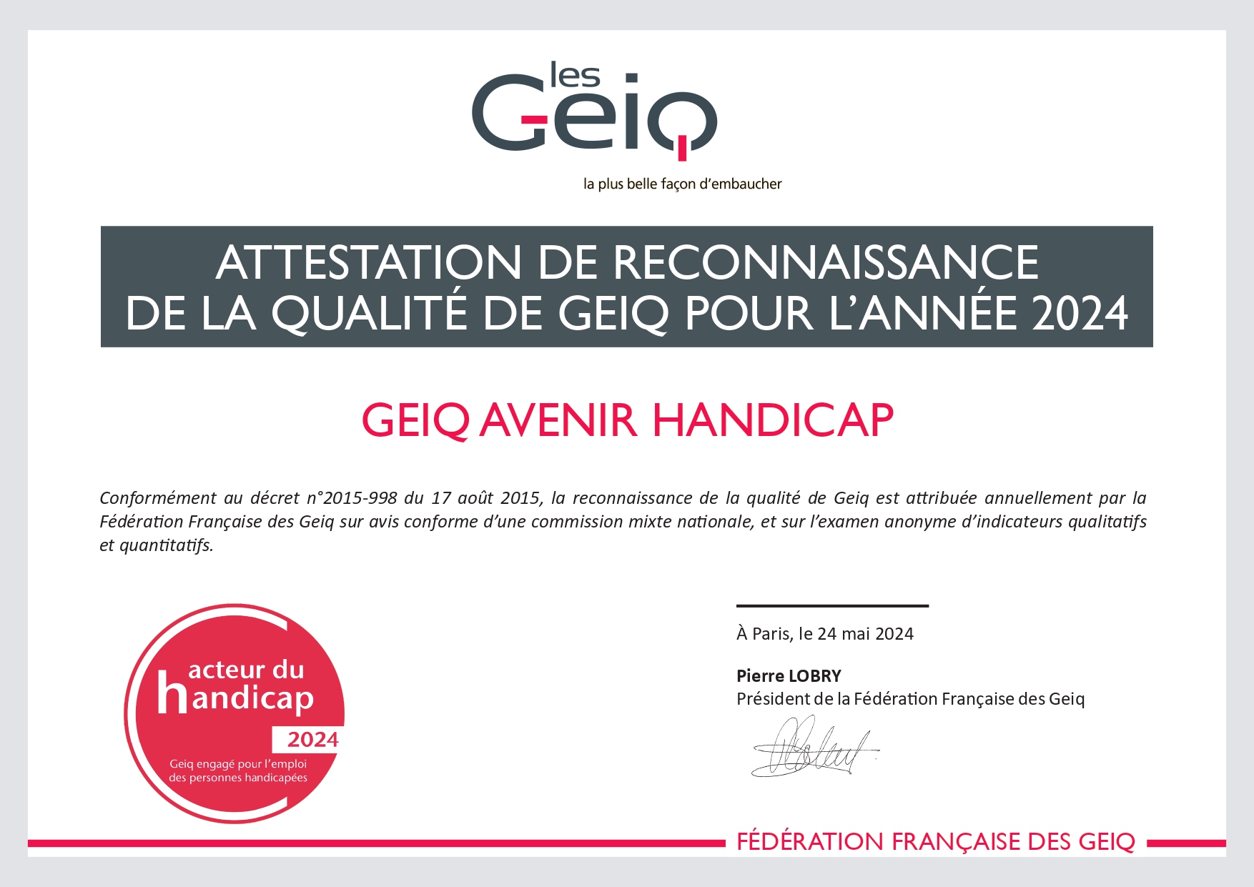 Nous sommes heureux de vous annoncer que Geiq Avenir Handicap a reçu le LABEL Geiq pour l’emploi durable pour l’année 2024. Ce label reconnaît notre engagement en faveur de l’inclusion des personnes en situation de handicap dans le monde professionnel, ainsi que notre volonté de promouvoir la diversité au sein de notre structure.